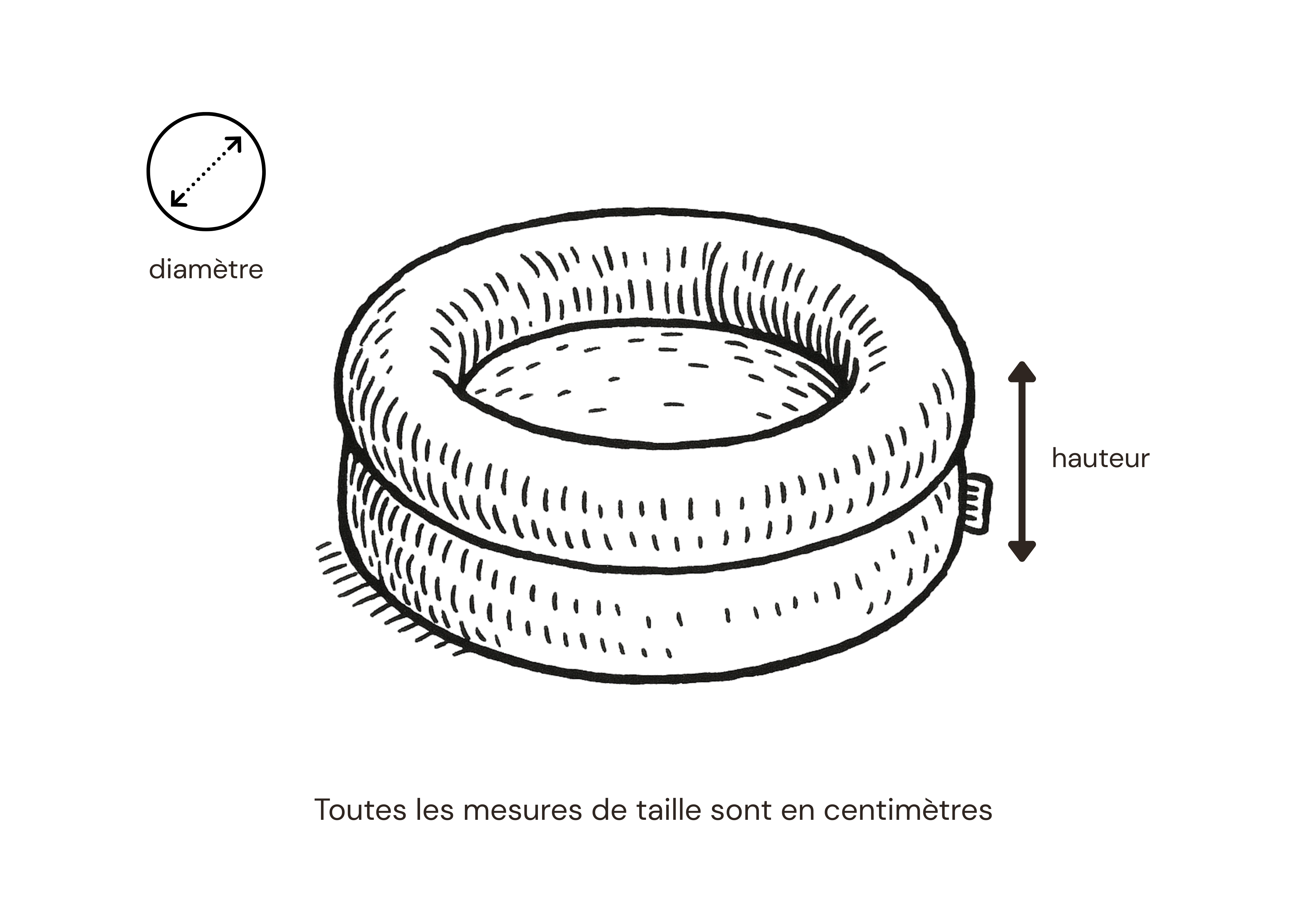 Pour choisir la taille idéale du donut, mesurez votre chien du museau jusqu’à la base de la queue. Si votre chien se situe à la limite entre deux tailles ou dépasse légèrement la taille maximale indiquée, nous vous conseillons d’opter pour la taille supérieure.